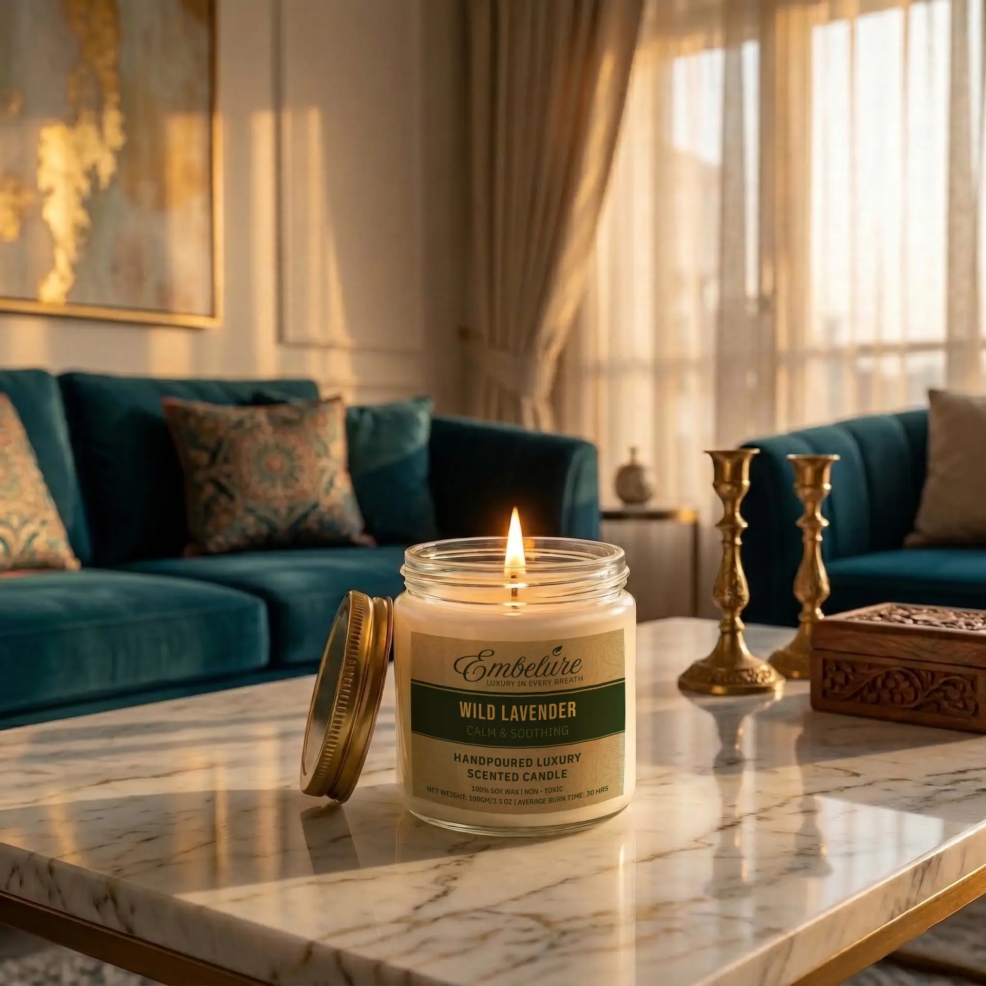 A calming wild lavender candle handpoured with clean-burning soy wax for peaceful evenings and daily relaxation.